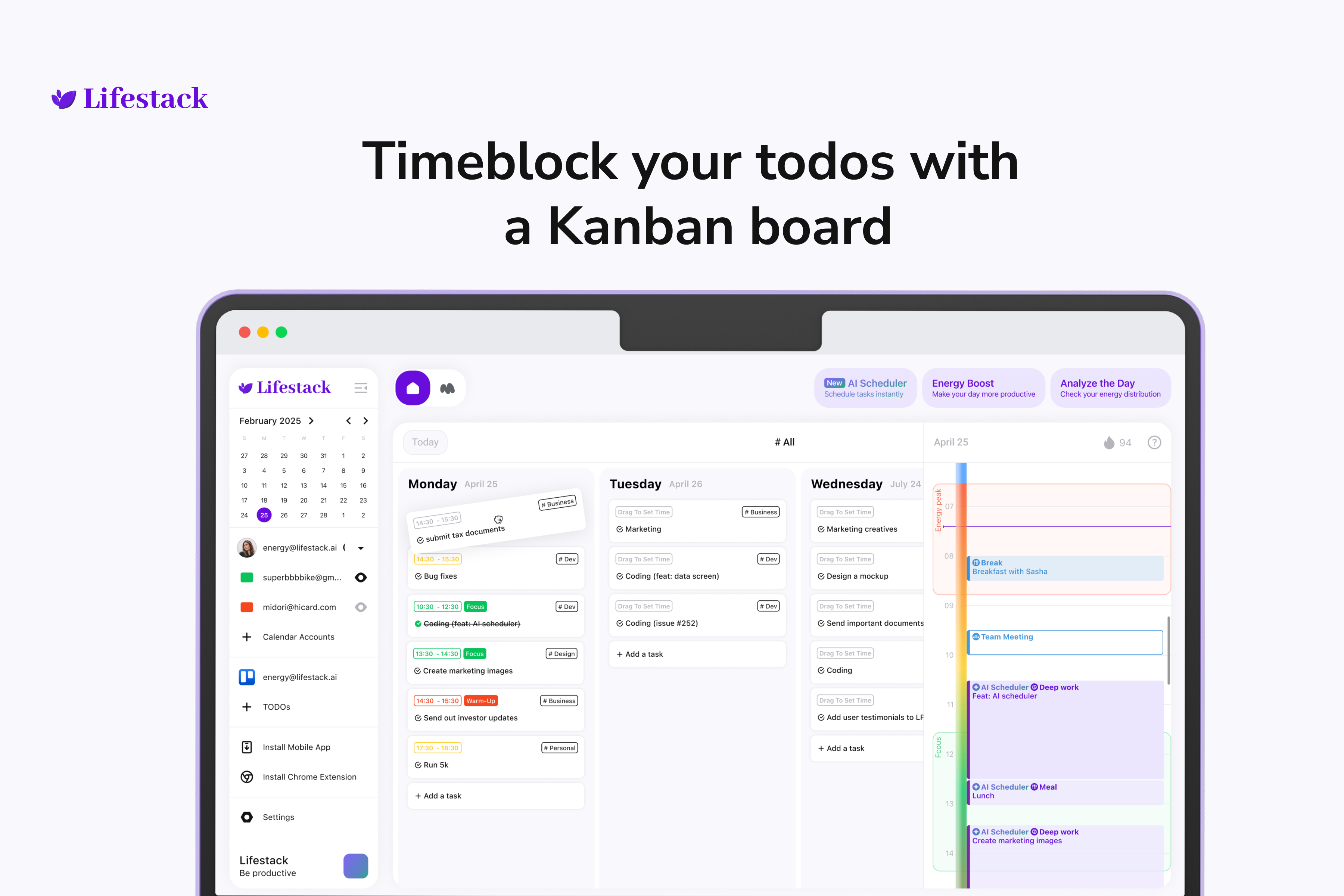 Lifestack syncs with health data from wearable devices to optimize scheduling based on energy levels. It helps you plan deep work when you’re most productive and take breaks when needed—helping you get more done without burning out.