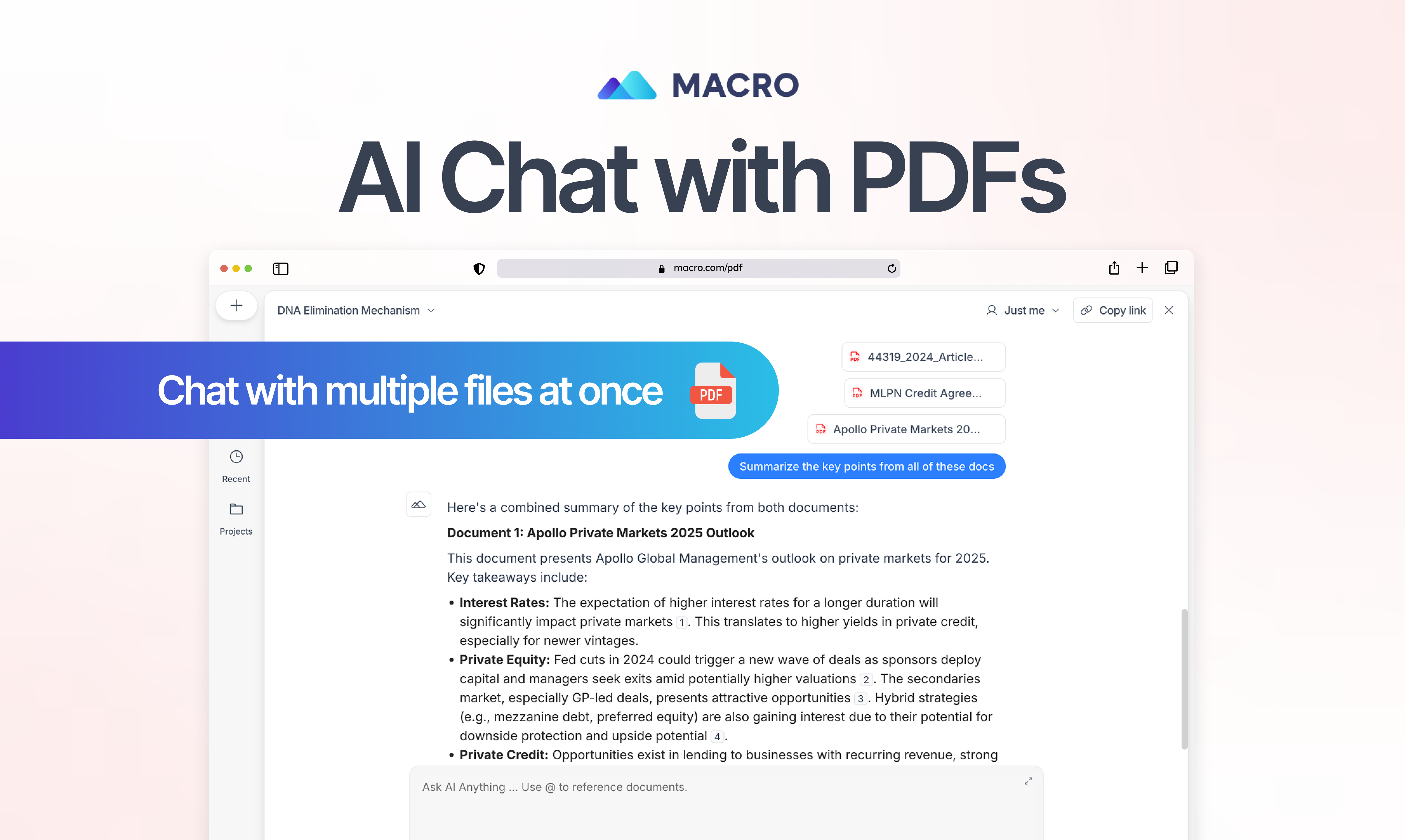Speed read complex PDFs with AI popups and AI chat. As you read, highlight anything you don't understand for a GPT-powered explainer. Or use Claude to chat with multiple PDFs and get links back to sources. Designed with love in 🗽NYC to be ⚡ lightning fast.